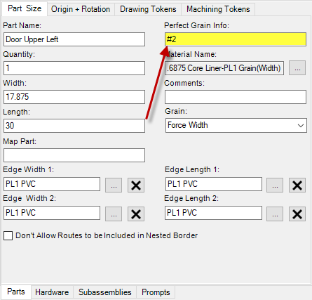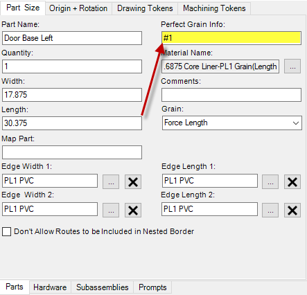 In the Perfect Grain Info box, enter the character # (pound sign or hash sign), followed by a number that will be used for all the parts to be grouped into a single grain matched group of parts in the nest or saw optimization. The program will try to group all like numbers, so be careful to use unique numbers for all the perfect grain groups in the products that will be included in any single work order.