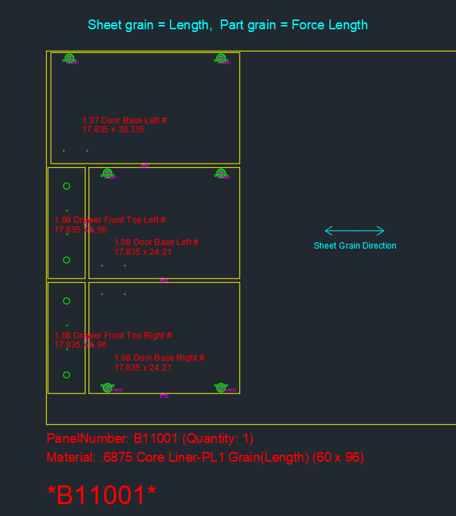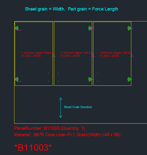 The Microvellum optimization algorithms produce what we call a "grain container" on the sheet layouts. The grain container contains all the parts that have been set up to be included in each group. That means that all part setup with #1 will be grouped into a single grain container.