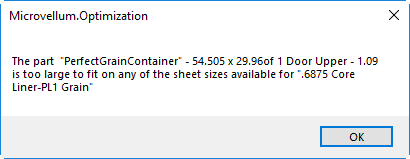 If the optimizer cannot fit a grain container on the material sheet, it will display a message indicating the size of the container and continue processing.