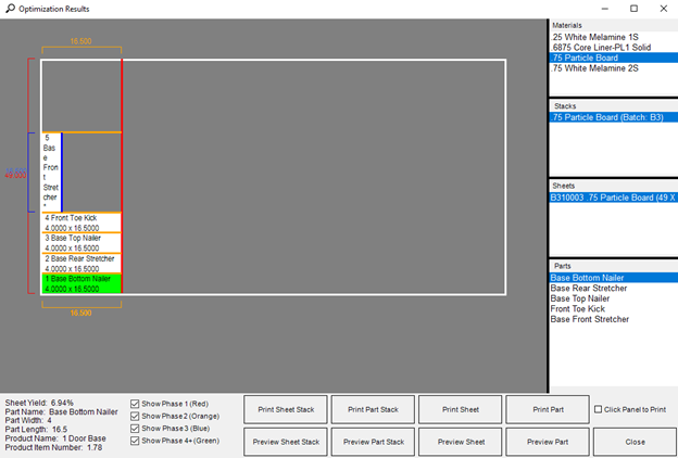 Selecting the Show Patterns button will display the Optimization Results screen. In the top right corner is the pattern list. Select a pattern from the list to display a visual representation of the optimized sheet and populate the parts list below the pattern list. If there are multiple stacks for the selected pattern, the Stacks list will also be populated after selecting a pattern. Select a part picture or the parts list entry to enable the printing controls located at the bottom of the screen. You have the option to print just the select part by selecting the Print One, Print Stack button to print all of the labels for the currently selected stack, or you can print the entire pattern and all of the stacks by selecting the Print Pattern button. The picture of the parts will change color based on different actions taken.