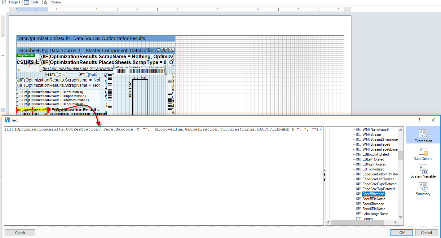 Using your knowledge of the sort order of your processing stations, and left-to-right order of dataset columns, you can determine which relationship you need to use to display the necessary data on the label. If you are printing nesting labels (Default Nest), but want to print part remake barcodes produced by a single part station (Default P2P), simply use the expression {OptimizationResults.OptResStation2.Face5Barcode} in the desired barcode component.