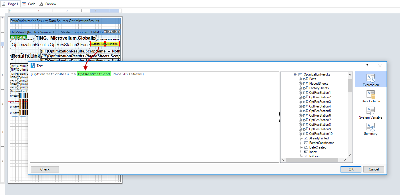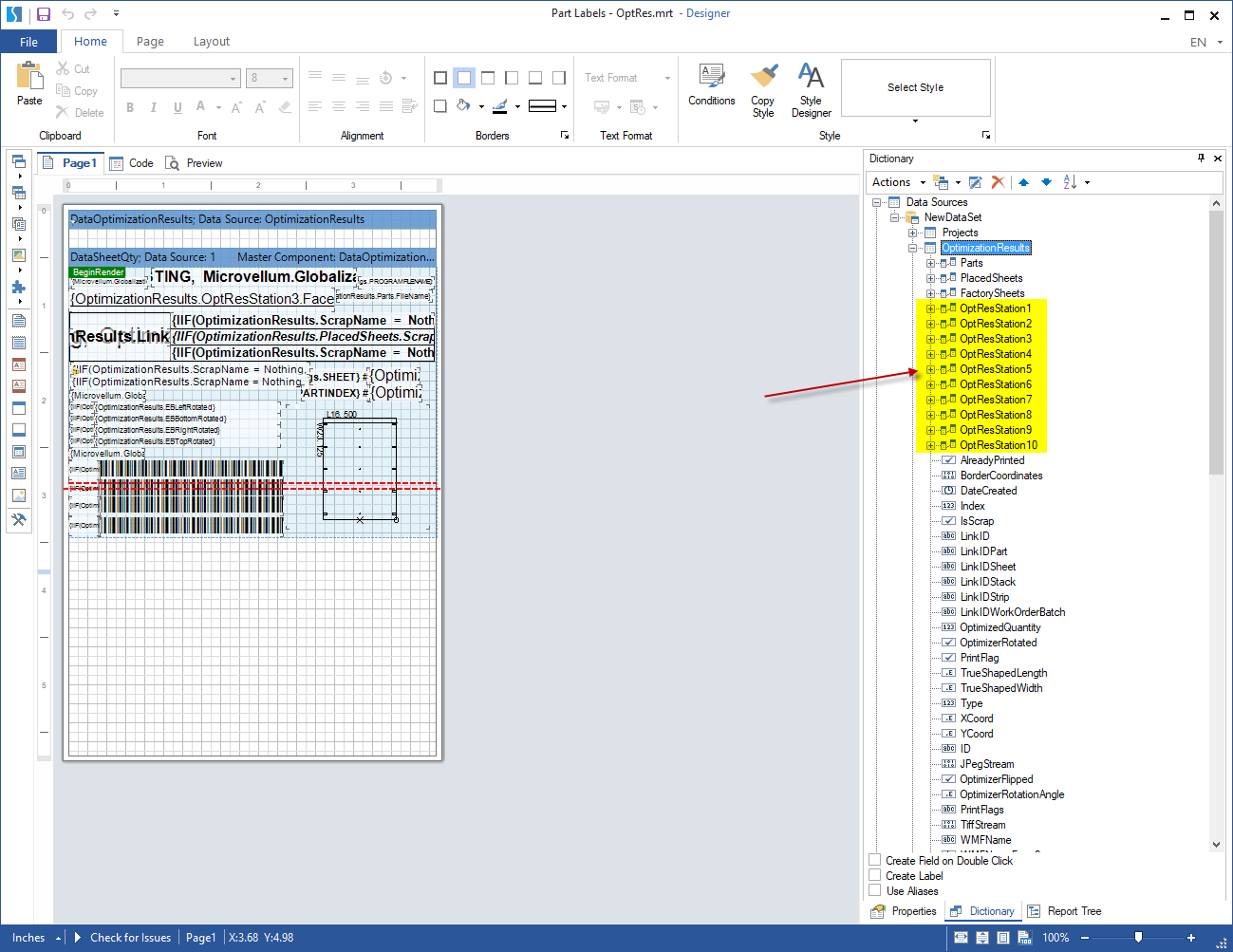 When you open a Placed Part Label in the Report Viewer or Report Designer, the program now creates a dataset containing ten additional columns in the table OptimizationResults when compared to the actual database table. We have named these additional dataset columns "LinkIDStation1", "LinkIDStation2," and so on, through 10.