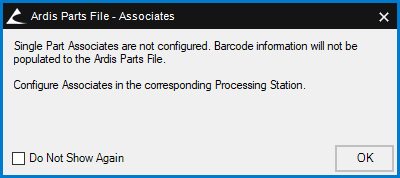 You may experience a warning message when you process using a Parts File type processing station. The exact text of the message depends on the type of stations included when processing. You may see multiple messages if processing with multiple incomplete parts file stations. The typical message is “(processing station type) Associates are not configured. Barcode Information will not be populated to the (parts file type) Parts File.” And “Configure Associates in the corresponding Processing Station.”