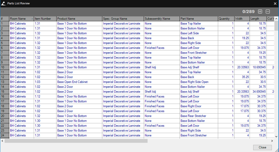 The interface allows you to view the materials, specification groups, dimensions, and edge banding that have been assigned to each product. By reviewing the parts list before processing work orders, you can ensure that your products have the correct materials and dimensions, which helps to maintain accuracy in the shop.