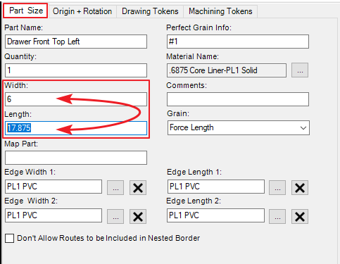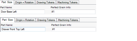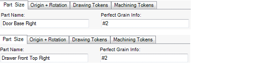 First, access the product properties and look at the left door and left drawer front and enter #1 in the perfect grain info cell for each part.