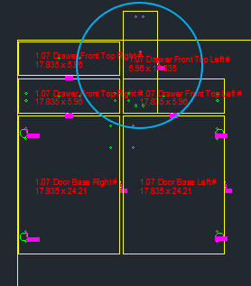 You can use this same logic to do perfect grain matching across multiple cabinets as well. For instance, you can tell the optimizer to match all the doors in the following image together by putting a #1 in the perfect grain info box for each door. The problem with this is all the doors will not all fit on one sheet, so it will need to be broken up. Putting #1 in the doors for 1.03 and 1.04 and #2 in the doors for 1.05 and 1.06 will then create two separate grain containers, which will then fit on a sheet.