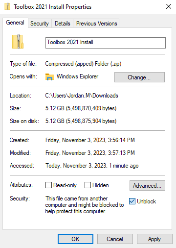 Fig. 1: Unblock the install package under "Properties".- If the file is a ZIP, you must extract the contents by right-clicking on the file and selecting "Extract All." Alternatively, if you are using another file compression app, extract it using that app.