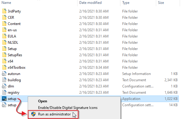 - Once you've done that, then find the file named "setup.exe" and right-click on it. Select "Run as Administrator."