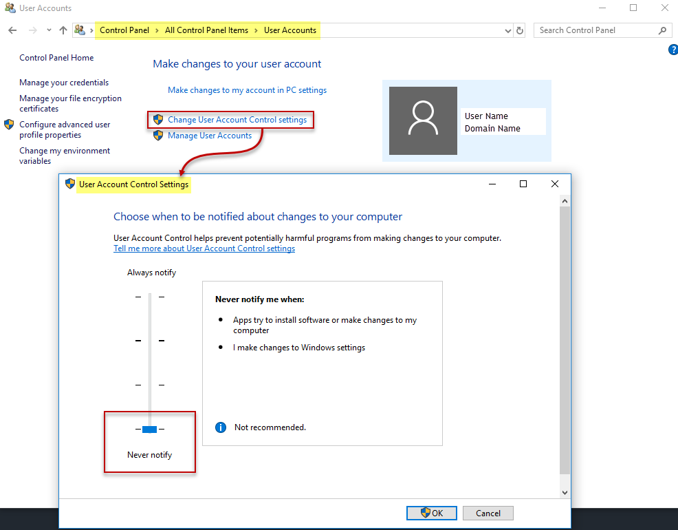 - Windows 10 - Control Panel > All Control Panel Items > User Accounts > Change User Account Control Settings