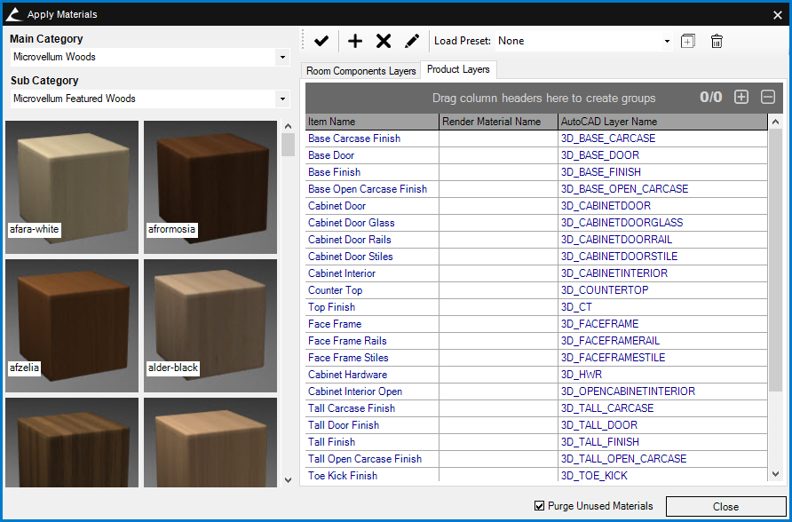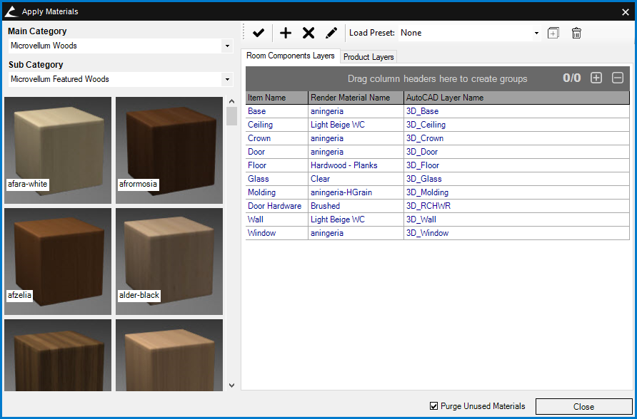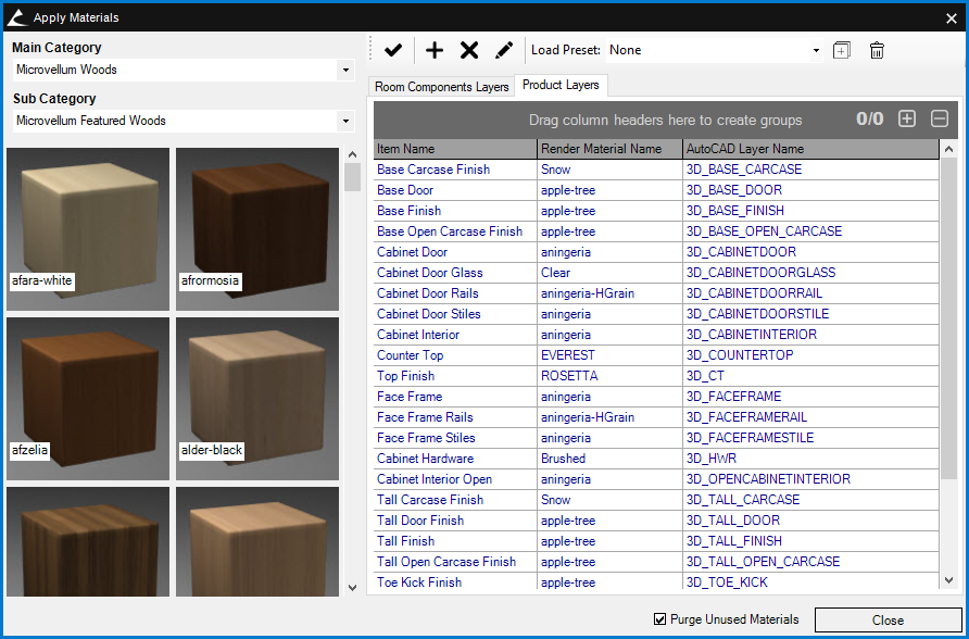 As of build 15.6.1806, the Microvellum Apply Material screen contains a column for the AutoCAD Layer Name. The purpose of this article is to provide an overview of the Apply Materials screen.