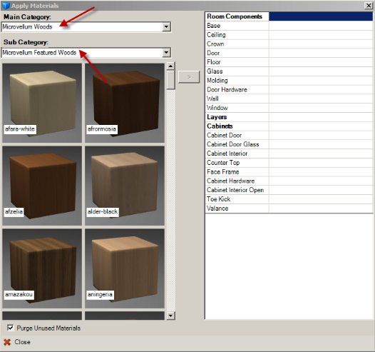 This opens the Apply Materials screen containing the Microvellum and non-Microvellum materials.