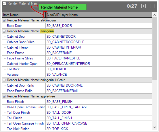 As of build 15.6.1806, the Microvellum Apply Materials screen contains a column for the AutoCAD Layer Name and revised controls. The purpose of this article is to provide a reference for commands and controls on the Apply Materials screen.