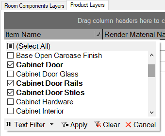 Each column header contains a dropdown box that you may use to filter what is displayed in the list below it without needing to scroll through long lists of items. For example, you may click to open the dropdown list for the Item Name and select Cabinet Doors, Cabinet Door Rails, and Cabinet Door Stiles. The list is then modified to include only those items. The lists are unique to any given preset.