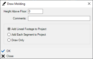After adding a molding, a prompt interface will follow. The interface will allow you to specify the height above the floor, add comments, and select how the molding will be drawn and added to the project.