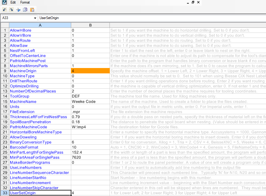 If nothing is in that row, or it contains a different variable, enter the new variable name in column A "UserSetOrigin" for later use. Add the following help text in column C: "1 for Lower Left; 2 for Lower Right; 3 for Upper Right; 4 for Upper Left."