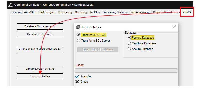 - Select the “Utilities” tab > Select “Transfer Tables” > Select the radio buttons “Transfer to SQL CE" and “Factory Database” > Select “Transfer” (see below).