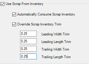 You specify if you want to override the scrap trim values set in the material inventory with the checkbox for Override Scrap Inventory Trim. This overrides the material inventory trim values with those specified here for a specific CNC machine or processing station. This would be used to minimize material loss from two separate rounds of trim cuts. The first trim cut is taken when the scrap sheet is cut from the original sheet, and the second trim cut is taken when the part is cut from the scrap sheet. This trim cut override allows you to quickly and easily reduce or remove the redundant trim cuts when the scrap sheet is cut from the original sheet without having to edit the four trims for each scrap piece, one at a time. To maximize material yield, these override trim values are set to zero by default, but that value may be modified as needed.