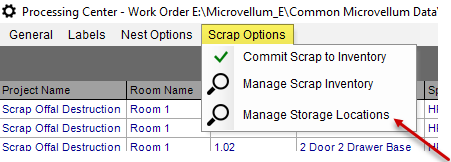 You may also manage the storage locations and other scrap options from within the Processing Center, using the Scrap Options menu.