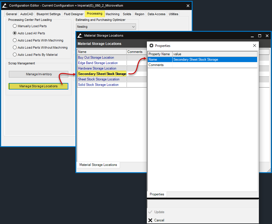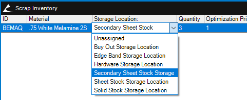 Once your locations have been set up, they are then available for specifying a Location property in each scrap material accessed from the Manage Scrap Inventory command.