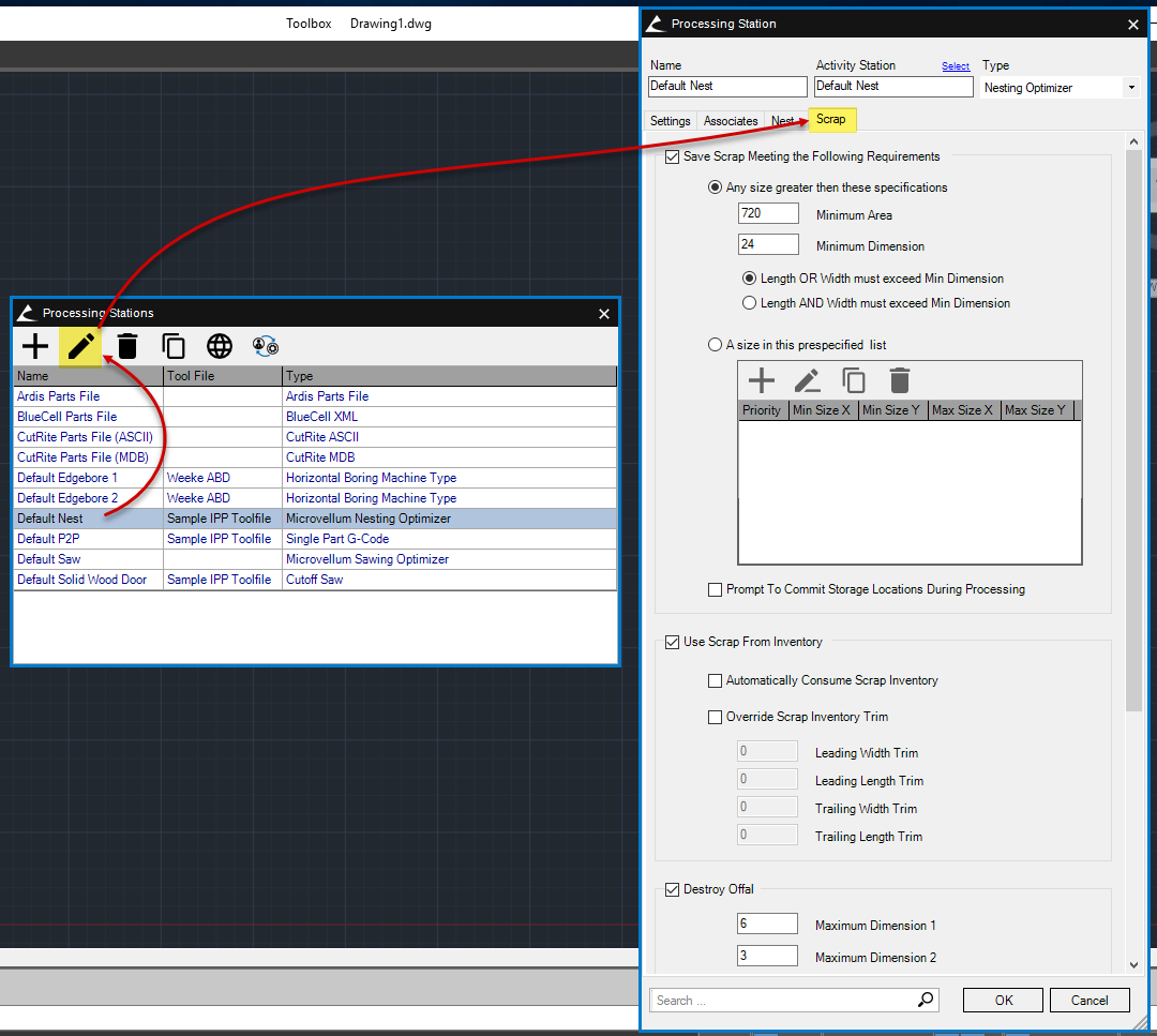 Remember that when processing and optimizing using a station of one of those two types, you must check the checkbox for the functionality you want to activate. This is done by editing the processing station, clicking on the Scrap tab, and checking one or more of the checkboxes shown below.