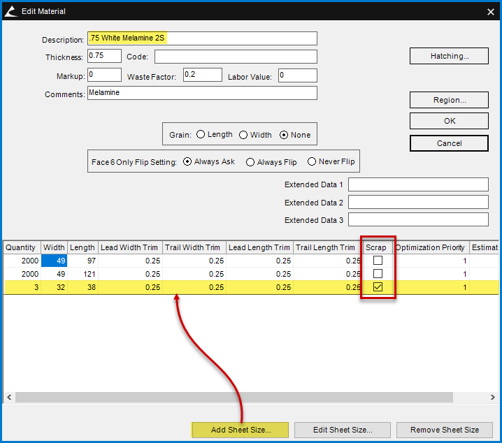 Fig. 07 – Added Scrap Sheet Size for a Material.