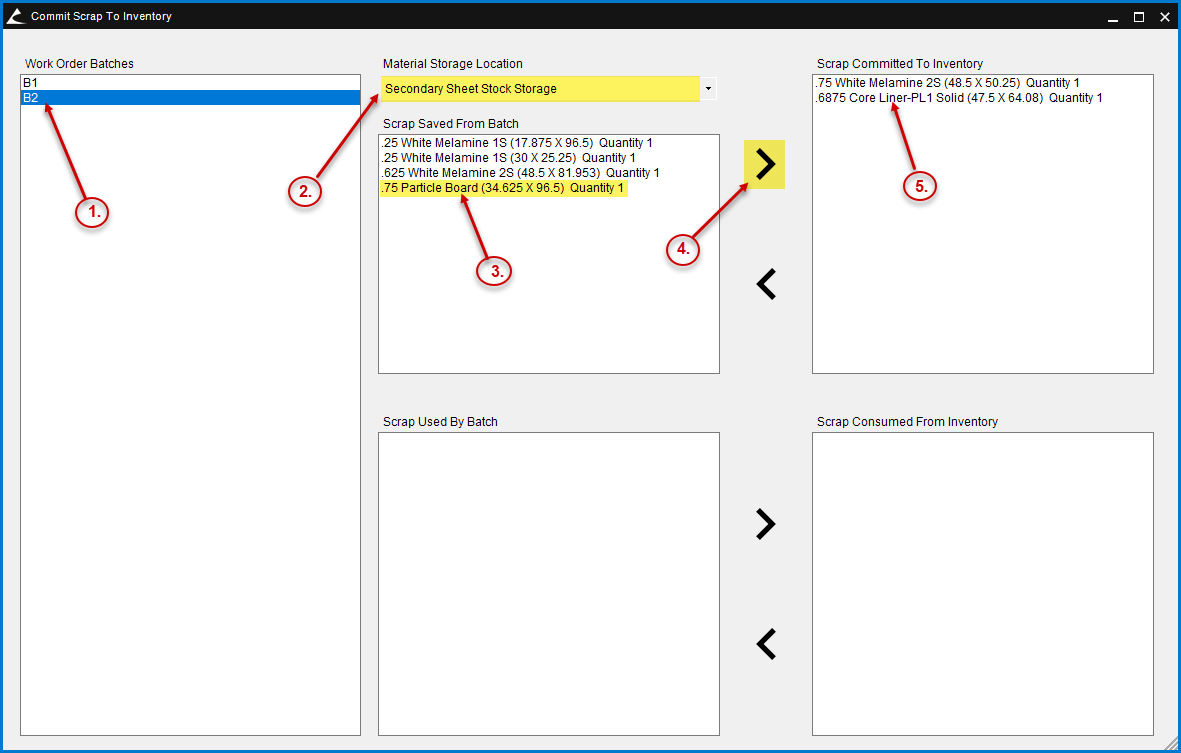 To add a saved scrap sheet, select the Work Order Batch, select the scrap material under the heading Scrap Saved From Batch, select a Material Storage Location from the dropdown list, and then click the arrow button. Repeat this for all saved scraps being saved to a storage location.
