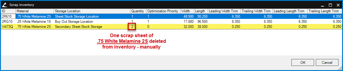 The screenshot below shows the material for ".75 White Melamine 2S" before and after three scrap sheets were added manually to the inventory, and a single scrap sheet has been committed from a scrap part generated when processing.