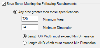 For the first scrap yield setting, you specify the minimum area for a scrap sheet, regardless of the precise width and length dimensions. If you apply a value of 720 square inches, the scrap sheet could either be 24" x 30", or it could be 16" x 45". They both equal the 720 value entered.