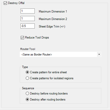 We understand that various users have different preferences for the order of machining the offal destruction relative to the nested parts. Therefore, we have included two options in the Sequence section of the scrap properties – Destroy before routing borders, and Destroy after routing borders. Select the option that best addresses your machining needs.