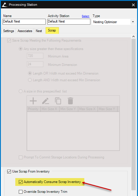 Within this dialog, you have the option of whether or not you Save or create scrap materials when optimizing, and whether you Use scrap from the inventory when optimizing. Check the appropriate checkbox.