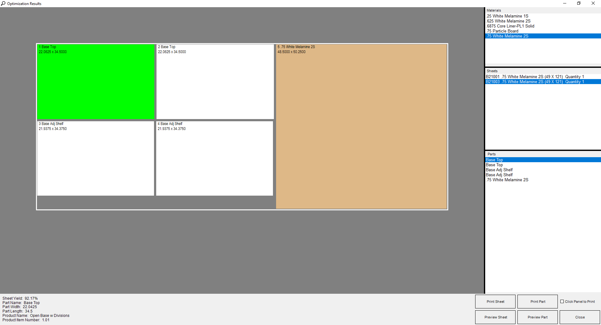 Print the part labels and place them on the parts as the machining process is completed. Each scrap sheet that was produced will be displayed as a part in the 'nested pattern' or 'sawing pattern' and will generate a label.