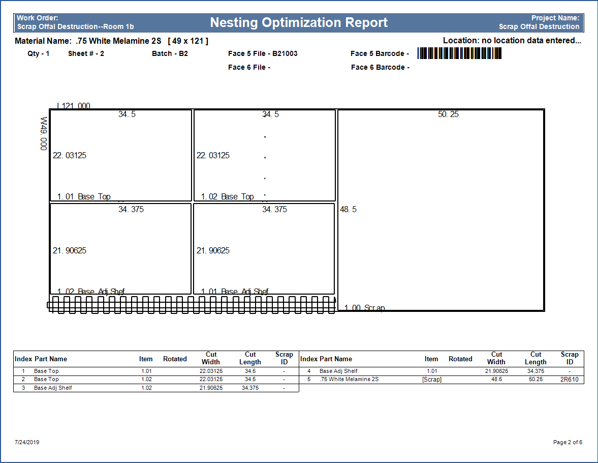 Microvellum contains functionality to generate scrap sheets when using the nesting optimizer or the sawing optimizer, as well as the ability to process the waste pieces that remain after the scrap sheets have been identified. A part label is printed along with the other optimized part labels, identifying the scrap piece, as it is stored for future use.
