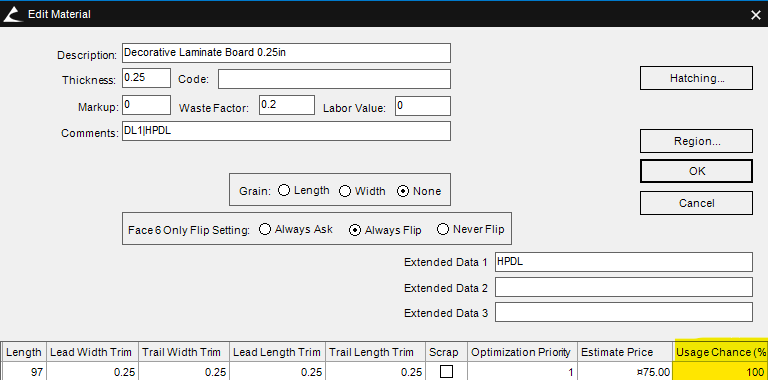 Figure 2: The new 'Usage Chance' column added to a sheet material in the material file.When Weighted Selection is selected in the optimizer, the UI of materials in the material file will change to include the “Usage Chance(%)” cell. Clicking on the cell allows one to adjust values using a vertical arrow controller. This allows the user to easily increase or decrease the usage chance while looking at all sheets. When adjusting the usage chance, the UI will keep the resulting value of all percentages at 100 by adjusting the other values automatically.