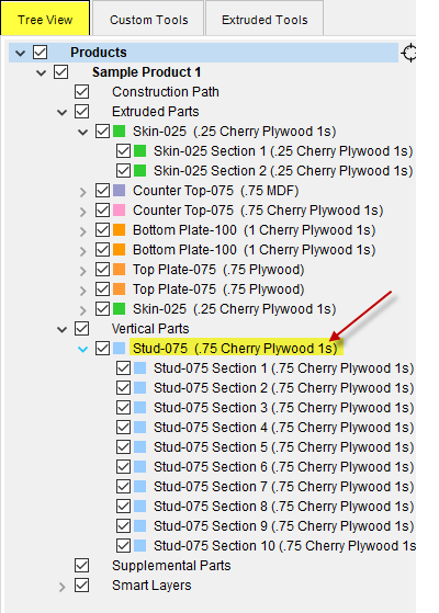 - As an example, suppose you want to modify a property of all the 3D parts drawn from the same 2D stud profile. Since they are all taken from one section profile, they will all be on the same smart layer. Notice below that on the Tree View tab, there is the part type name (Vertical Parts), the smart layer name (Stud-075), and the part names that are numbered (Stud-075 Section 1, etc.). The smart layer name is highlighted.