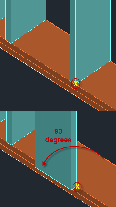 - Enter the rotation angle. The point of rotation for this command is the Z-axis that passes through the corner of the vertical entity closest to the section profile origin point and the starting vertex of the construction path polyline.