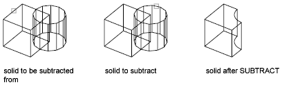 Objects in the second selection set are subtracted from objects in the first selection set. A single new 3D solid or surface is created.
