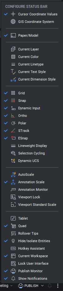 The status bar can be customized using by clicking the 3 vertical dots on the right end of the bar. This will prompt a pop-up menu containing every status bar field. Click on different fields to either enable them (if unchecked) or disable them (if checked) . Enabled fields will appear on your status bar.