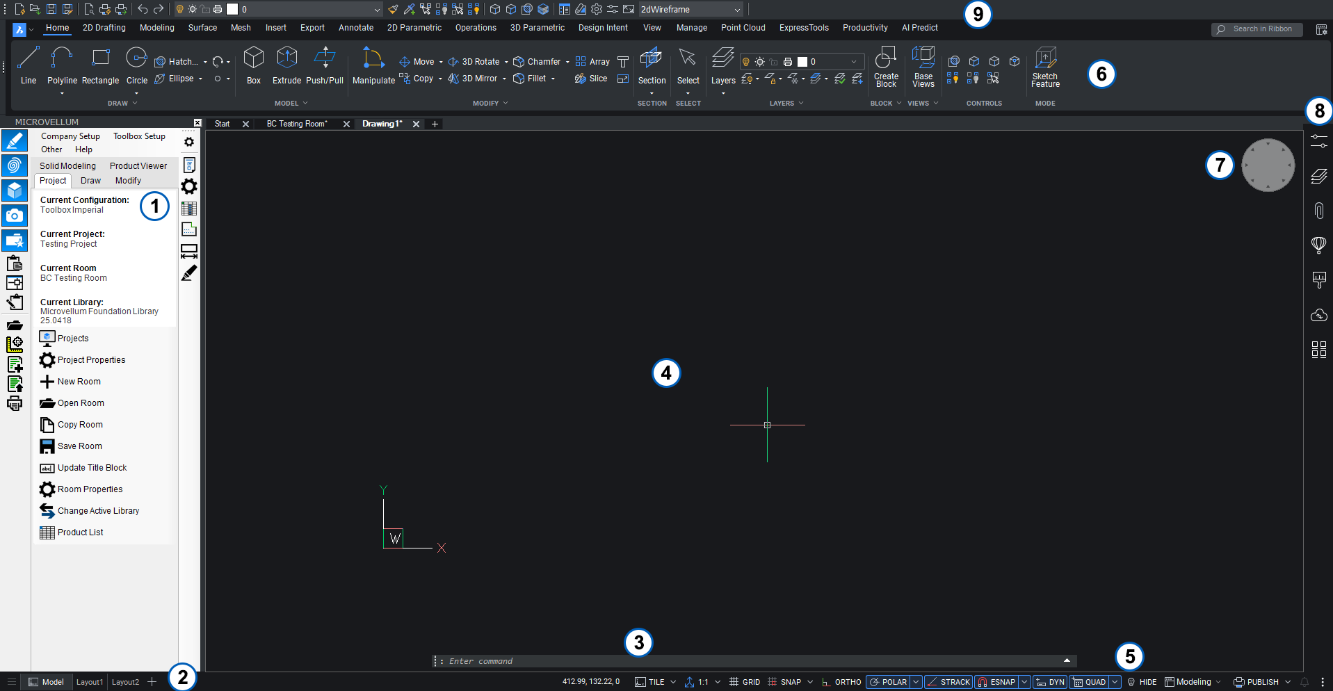 The BricsCAD interface is capable of being customized to best suit your workflow and design process. Different workspaces can be selected by right-clicking on an empty space in either the ribbon or panels bar, then hovering over the “Workspaces” option. The default workspace in BSB is the “Microvellum” workspace, which is set up to resemble the familiar layout of the OEM interface. This workspace also has Microvellum command tabs set in the Quad to enable smooth, quick control of products.
