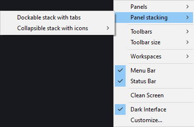 The method of panel bar expansion with respect to drawing space is also customizable by hovering over the ‘Panel stacking’ option in the menu. 3 options are available for controlling how your panels appear within your workspace: