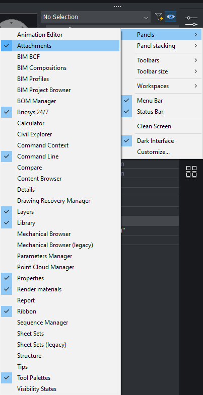 The Panels section of the interface can be docked in multiple places on the interface by dragging and dropping it. Panels can also be customized from the same pop-up menu as workspaces, by right-clicking in an empty space in either the ribbon, panels, or the toolbars. Hover over the ‘Panels’ option. The full range of options for your panels will be displayed, allowing you to select which ones appear in your panels bar.