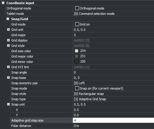 - Adaptive Grid Step Size: Controls the snap spacing for ‘Adaptive Grid Snap’ mode of SNAPTYPE system variable, in pixels. Also, it controls the step size of the manipulator ruler.