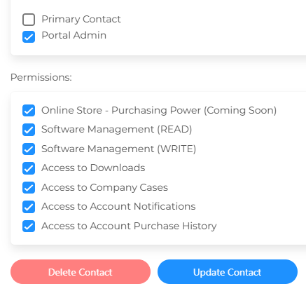 At the bottom of this section, a series of checkboxes allow administrators to appoint a company contact as the primary contact for your company (meaning all automated cases will be sent to that contact; there can be only one primary contact in a company), or a portal admin (which grants access to all permissions, the ability to change permissions on other contacts, and all other associated permissions in the Microvellum Client Portal). Permissions for the contact currently displayed can be manually modified at the bottom of this section, allowing administrators to selectively assign permissions to perform actions like download files from the portal, access company-associated cases, view purchase history, and more. Admins can also delete a contact from their company by clicking the left button at the very bottom of this section.
