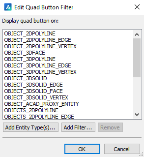 Click on the button on the right end of this filter, open the Edit QUAD Button Filter, then select either “Add Entity Type(s)” or “Add Filter”. Selecting “Add Entity Type(s)” will allow you to select the various types of entities which, when selected in drawing space, will result in your MV commands appearing in the QUAD menu. Alternatively, selecting “Add Filter” will allow for the creation of a custom filter, or the selection of presets such as No Selection (commands will appear when no entity is selected), Any Object (commands will appear when any single object is selected), or Any Objects (commands will appear when multiple objects are selected). By default, all Microvellum QUAD commands in the Microvellum workspace are set to Any Objects to ensure the tabs are always visible in the QUAD.