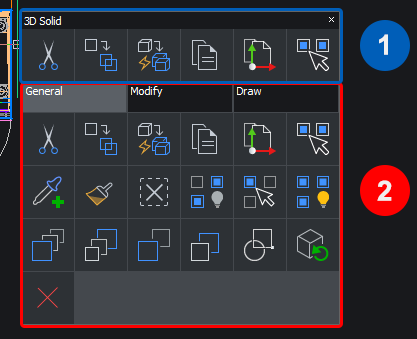 The QUAD’s interface can be divided into two major sections, both of which host appropriate commands for easy usage without requiring the opening or navigation of ribbons: