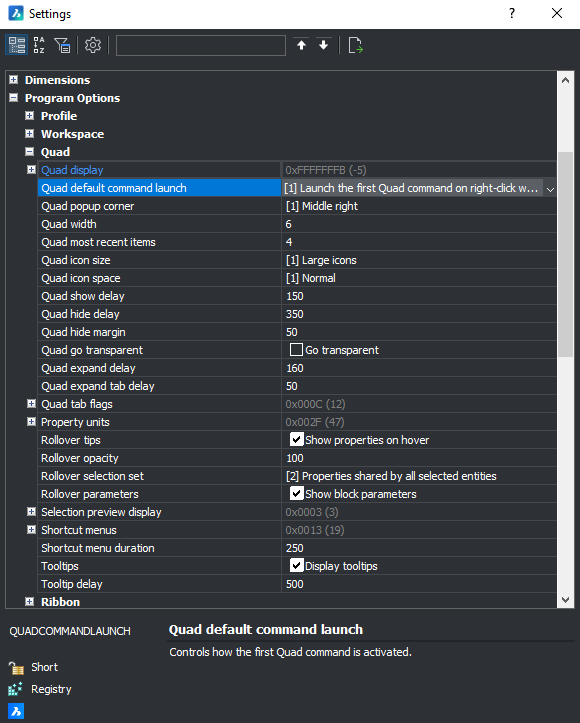 - Rollover tips: Specifies whether entity properties display in the QUAD while hovering. See the ROLLOVERTIPS system variable.