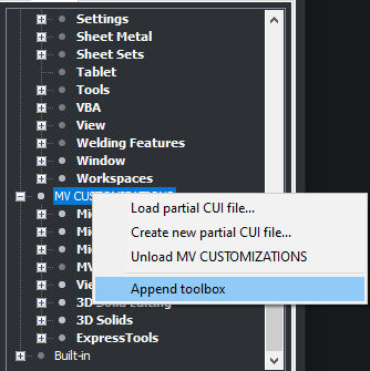 With the Customization menu open, you should see the MV CUSTOMIZATIONS category in the right column, with the 4 MV command tabs beneath it. To add your command, right-click on one the tab you would like the command to appear in, then select the “Append Tool” option. Enter the title (the name/alias of the command), the command itself (the full name of it with no spaces), and the icon you would like to associate with the command in the QUAD. When selecting an image, set it to “bitmap” to allow for the manual selection of the image. When selecting the image for your command, it is recommended to use an icon that is appropriate for the theme you intend to use with your BSB software (view