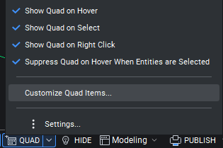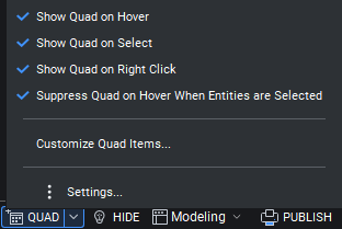 To toggle the QUAD’s display, click the “QUAD” button on the bottom status bar of the workspace. Deselecting the button will prevent the QUAD menu from being displayed under any circumstance. Selecting the arrow on the button will allow you to change the specific conditions or triggers for the QUAD menu display.