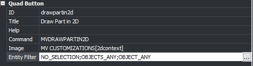 The Entity Filter variable allows you to define the specific entities that cause the command to appear in the QUAD menu. Broadly speaking, Microvellum products and drawings are categorized as either 2D polylines (elevations and section drawings) or 3D objects (products and solid models).