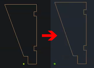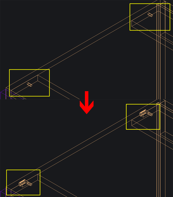 Fig. 6: IFS Peanut fasteners not appearing (top) and appearing correctly (bottom).- When creating cabinets with machining for small hardware parts (such as invisible fasteners) that are extruded along a path, the hardware would not appear in the model.