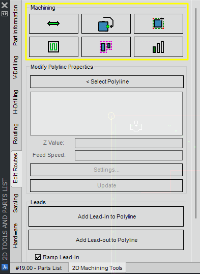Fig. 2: The 2D Nesting Tools. - There was a problem with the command line when editing 2D parts. When editing a part in 2D, and attempting to use the 2D nesting tools, if the command line is still active in the program when attempting to select a tool, rather than receiving a pop-up warning that the command line was still active (as one is intended to see in this scenario), users would instead experience an error.